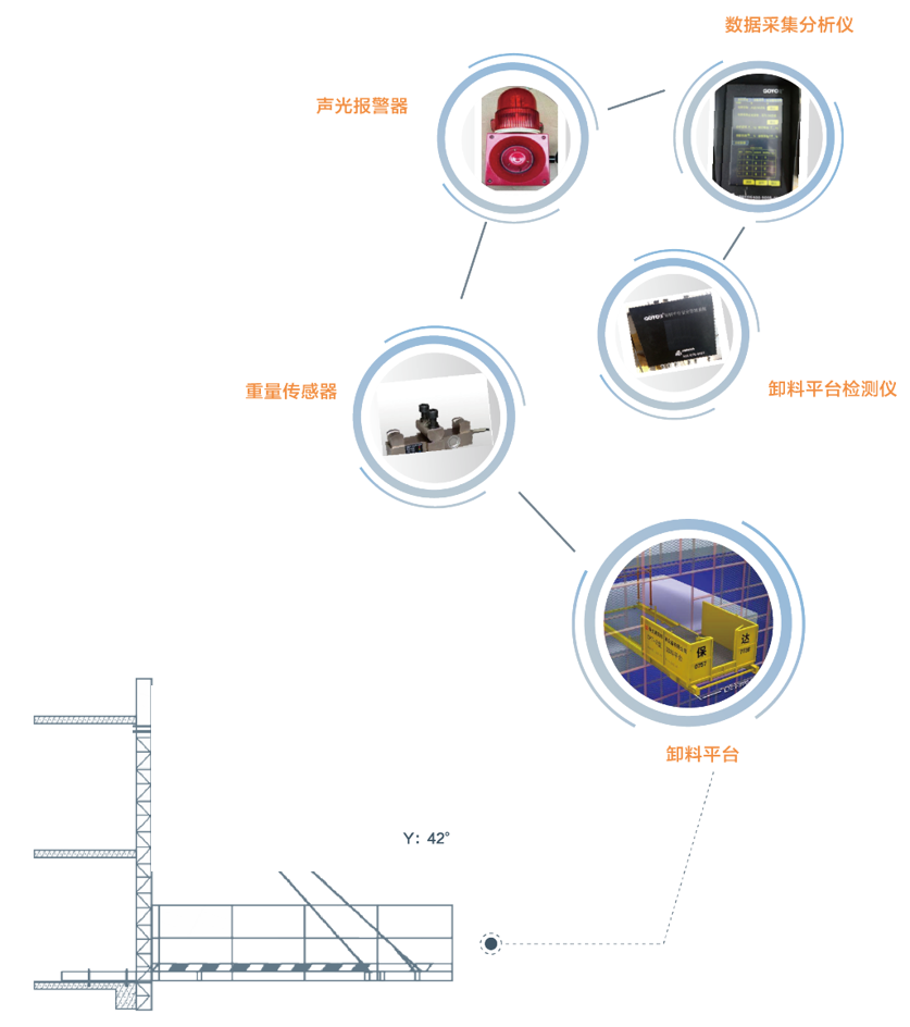 通過對卸料平台載荷等相關情況監測管理,重量傳感器實時進行運行過(guò)程的監控,超超載進行報警,並將在中數據傳輸到平台通知(zhī)相關負責人(rén)。平台附近安裝聲光報(bào)警器,第一時(shí)間進行現場報警,避免可能發生的(de)傾覆(fù)和墜落等事故。